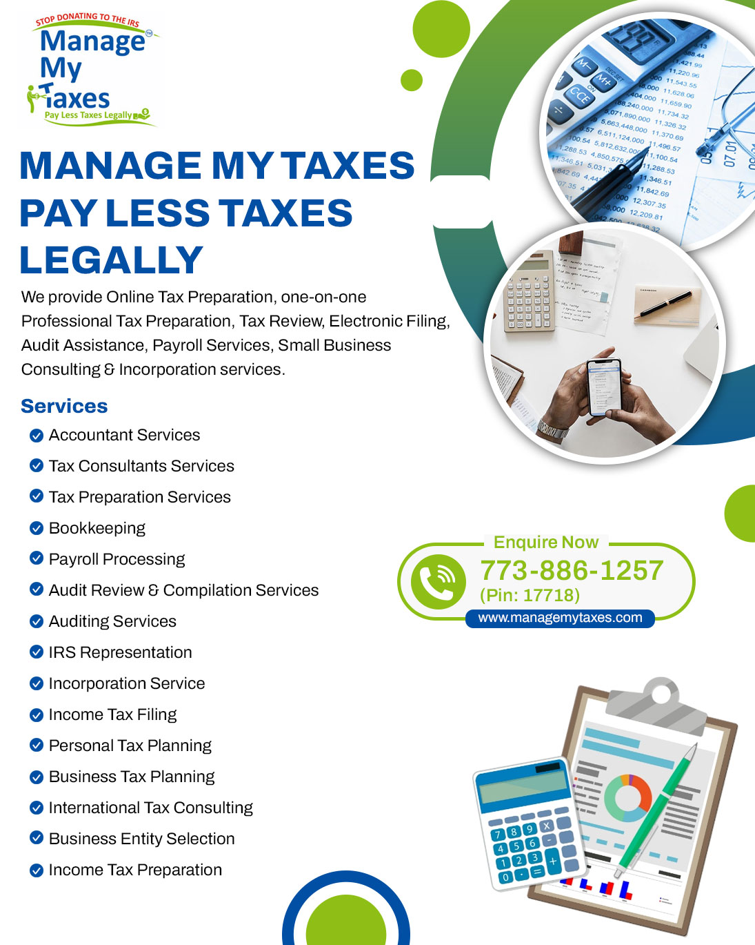 Founded in 2008 and headquartered in Alpharetta, Georgia, Manage My Taxes Inc specializes in comprehensive tax reduction strategies. Our mission is to help individuals and businesses legally pay less in taxes through proactive planning, IRS-certified services, and personalized financial guidance.