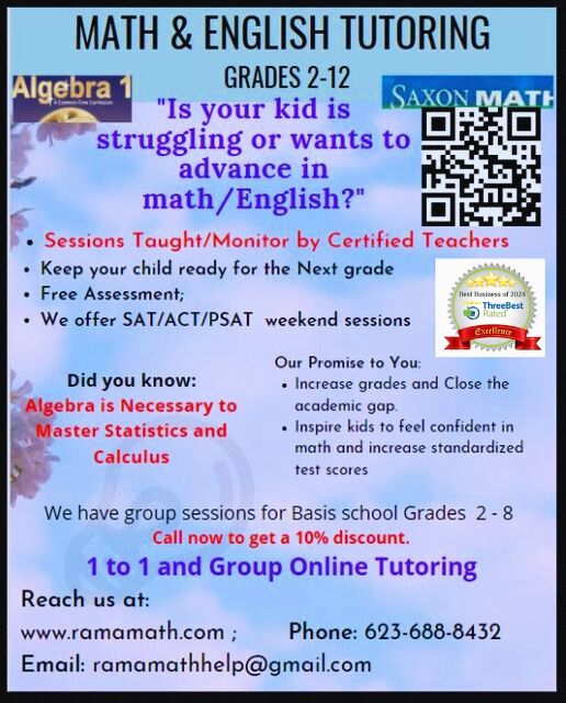Based in Glendale, AZ, we are a leading provider of Math and English tutoring services. We specialize in a wide spectrum of tutoring services, ranging from ACT and SAT preparation to specialized tutoring in subjects like Algebra, Biochemistry, Biology, Calculus, Chemistry, Economics, Geography, Geometry, History, Physics, Precalculus, Reading and Writing, Science, Social Science, Social Studies, Statistics, and Trigonometry. We also offer K-12 General Math, Spoken English Classes, Nursing Tutoring, English Tutoring, Public Speaking Classes, AP Calculus AB, Summer Camps and Classes, Coding Classes, and Phonics Classes. Our service area spans across the nation.