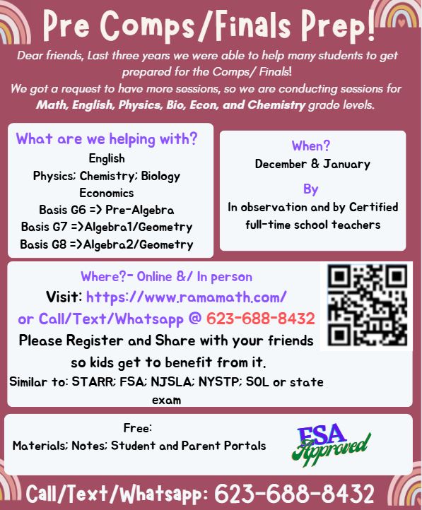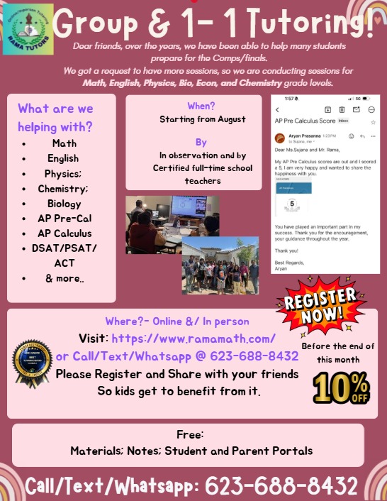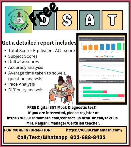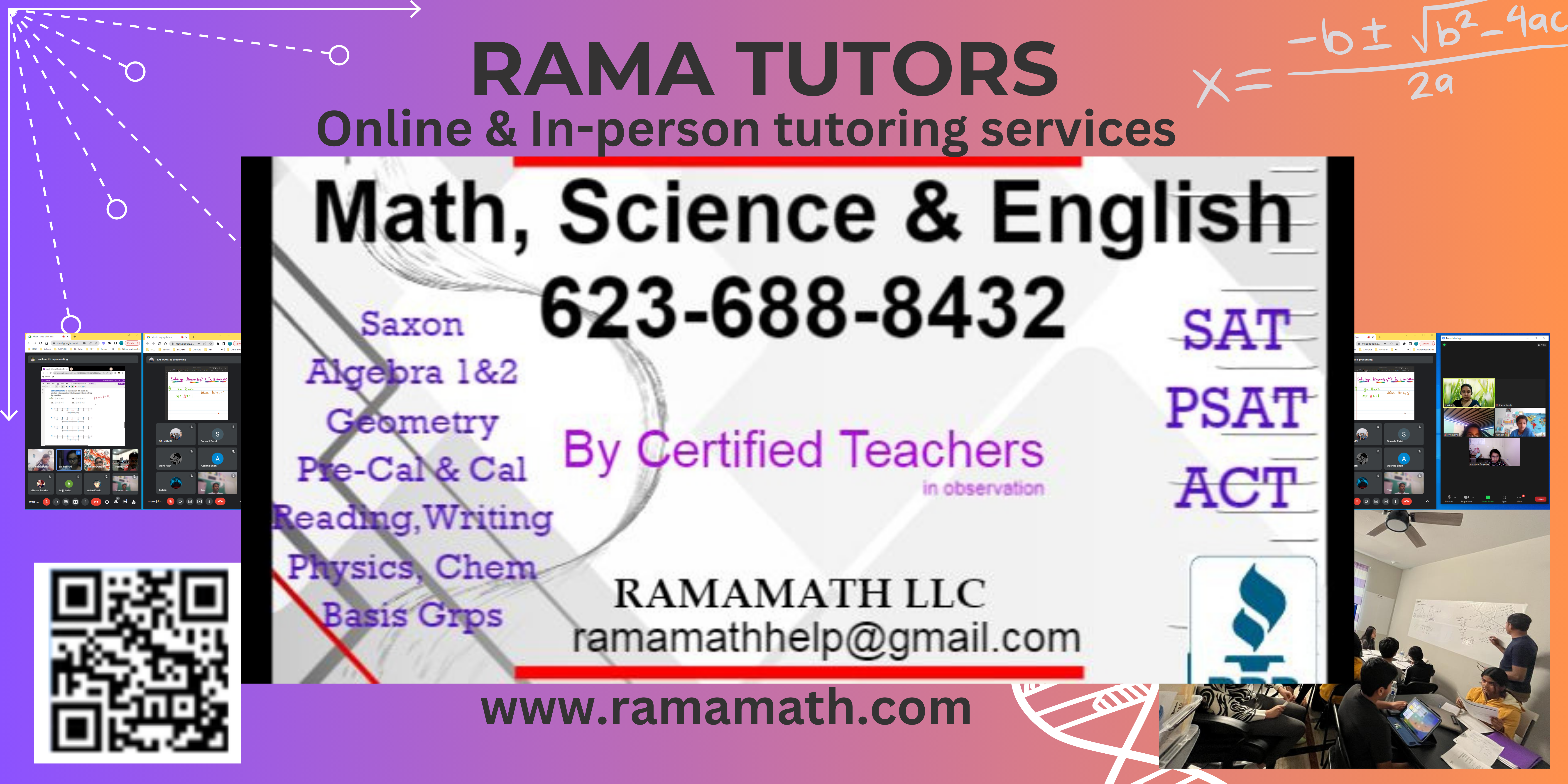 We have been working as teachers for a long time, and we are a group of teachers who help students with various subjects, including Math, English, Science, and Digital SAT/ACT/PSAT. We want to teach kids the skills and techniques that we use every day.We work with students in elementary school, grades 3 and up, and through college. By seeking tutoring at an early age, students can improve their competence, which has a positive correlation with their confidence. Improving learning efficiency and developing good study habits leads to less stress in future classes.Online tutoring sessions are hosted via Zoom or Google Meet. After an online session is scheduled, a confirmation email will be sent to the student and parents notifying them of the lesson. Included in the email will be a link to the session. All the student needs to do is click the link, and the online session will begin. No need to create a username or download any programs.To know more details, kindly contact us.