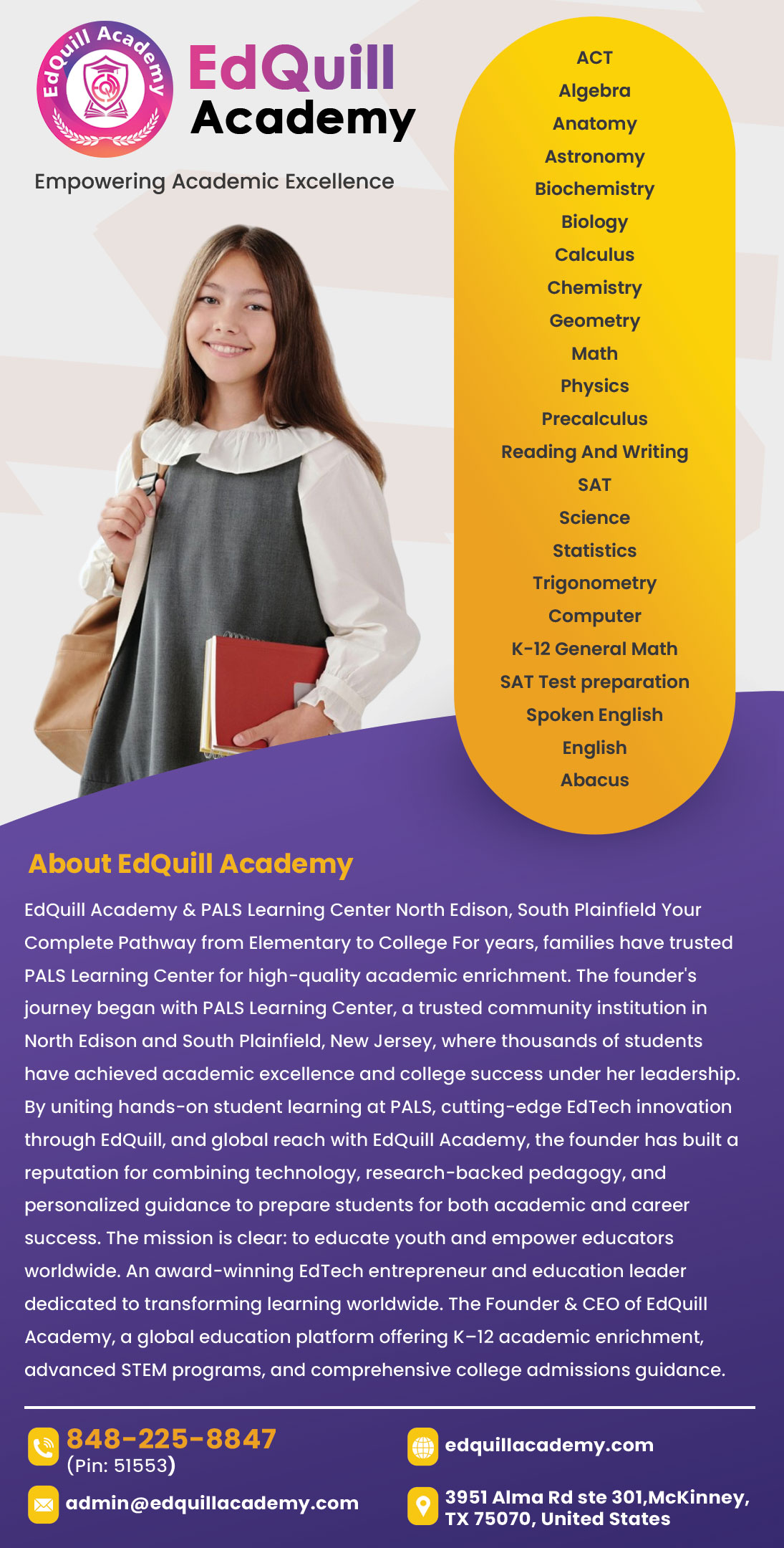 EdQuill Academy & PALS Learning Center North Edison, South Plainfield Your Complete Pathway from Elementary to College For years, families have trusted PALS Learning Center for high-quality academic enrichment. The founder's journey began with PALS Learning Center, a trusted community institution in North Edison and South Plainfield, New Jersey, where thousands of students have achieved academic excellence and college success under her leadership. By uniting hands-on student learning at PALS, cutting-edge EdTech innovation through EdQuill, and global reach with EdQuill Academy, the founder has built a reputation for combining technology, research-backed pedagogy, and personalized guidance to prepare students for both academic and career success. The mission is clear: to educate youth and empower educators worldwide. An award-winning EdTech entrepreneur and education leader dedicated to transforming learning worldwide. The Founder & CEO of EdQuill Academy, a global education platform offering K–12 academic enrichment, advanced STEM programs, and comprehensive college admissions guidance.